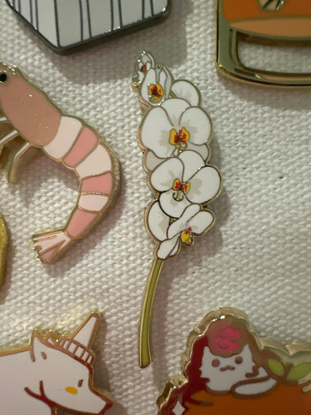 – Detailed UV-printed enamel pin showcasing a stunning white Orchid floral design