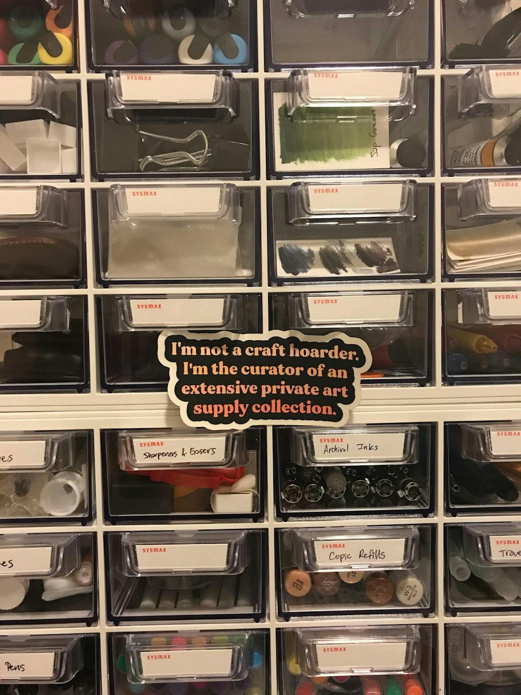 This quote "I'm not a craft hoarder. I'm the curator of an extensive private art supply collection." Comes in two styles - a simple gradient version in neutral colors and a bright floral hand-lettered style.